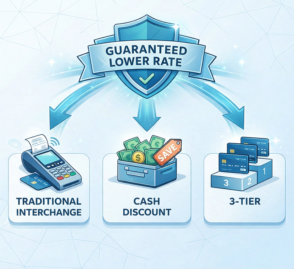 We have three types of terms: traditional interchange processing, cash discount, and 3-Tier. Easily switch between processing types as your business needs.