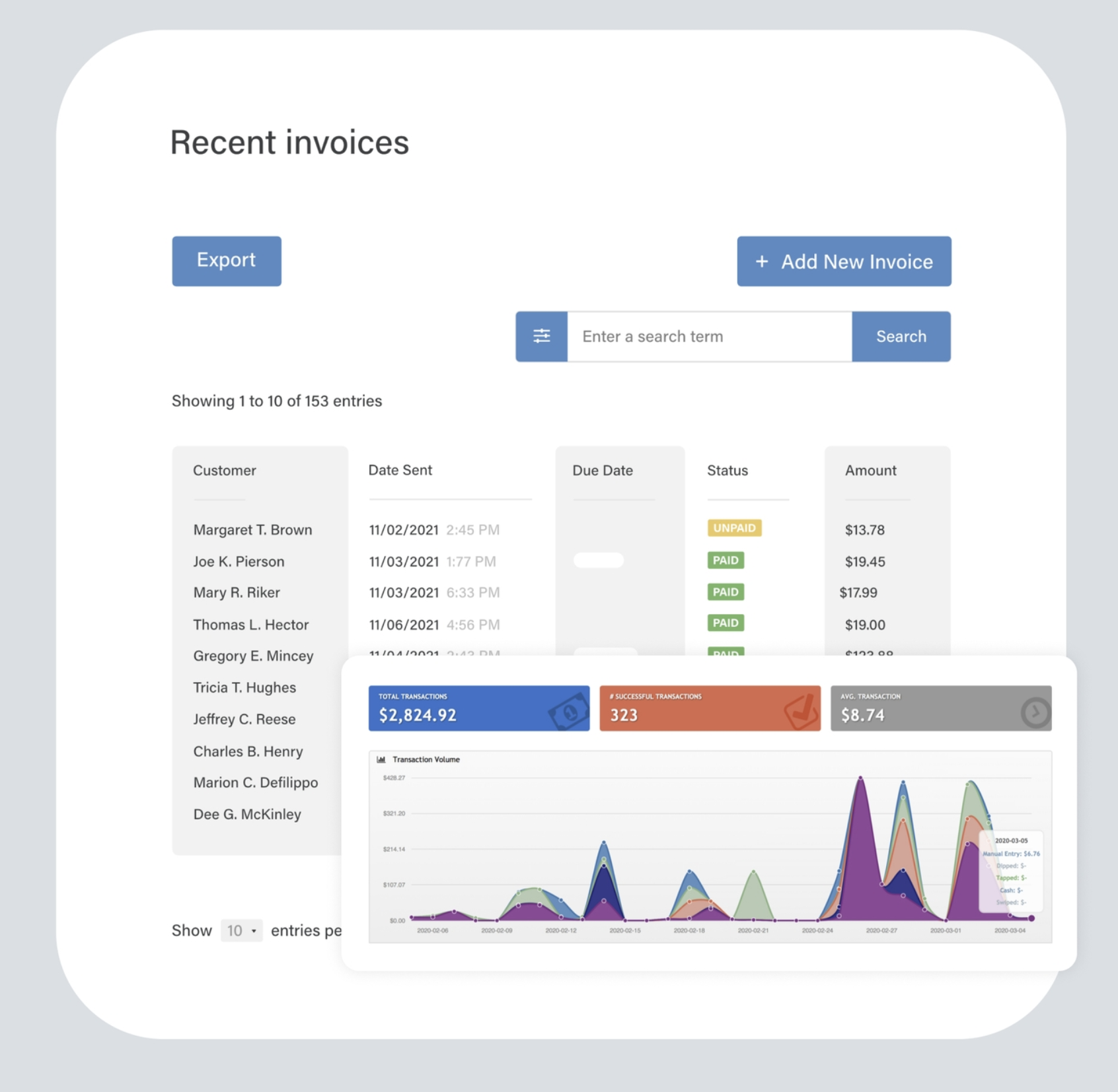 Speed up your bookkeeping. Export transaction reports in a format compatible with third-party tools like QuickBooks and Excel.